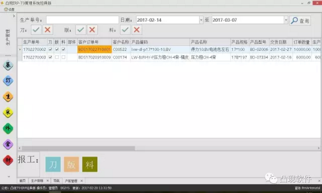 生产过程:当刀版料确认OK后,机长只选相应机台,选择机长名,点开始加工,完成点加工完成!完成后自动产生相应的报表,包括每个机长多少车头,多少平方,多少数量。日产能,月产能都可以统计出来!当然这个过程是实时的,方便前端跟单查看进度到哪里,不用老跑车间找货了!